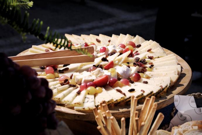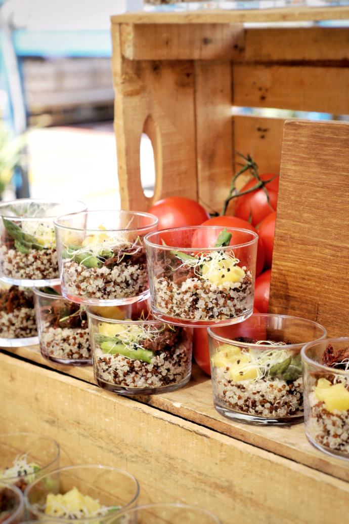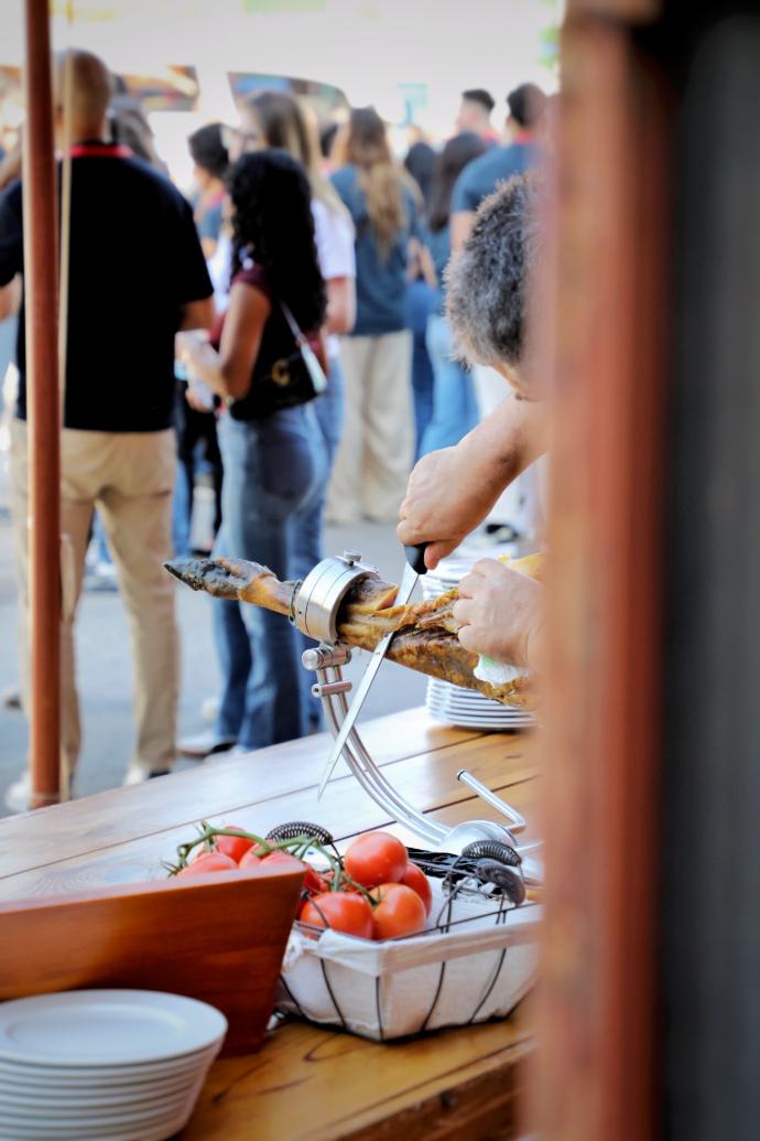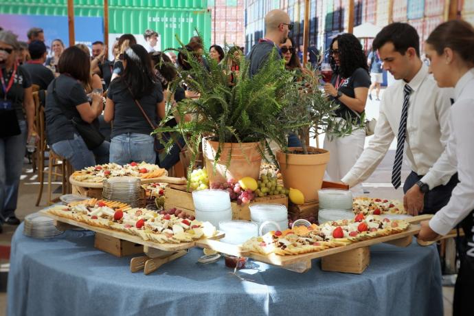 Para poder atender a los casi 500 asistentes con la máxima comodidad y fluidez, nuestro servicio se organizó para estar siempre disponible. Mientras nuestro equipo de camareros atendía de forma personalizada a cada grupo de personas ofreciéndoles aperitivos, vinos y refrescos, se habilitaron en diferentes zonas del espacio estaciones gourmet tipo jamón, quesos y también un puesto de comida Veggie que fue un total éxito, así como barras de bebidas, vinos y refrescos.